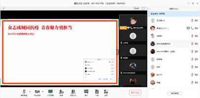(武汉)关于调整2019-2020学年第二学期本科教学工作安排的通知》的精神要求, 064182团支部积极响应学校“停课不停学”的号召,组织各位同学在家中举行线上团会。在活动开始前,每一位支部成员均提前上线签到,体现了同学们对本次团会的重视程度。14时,全体在线上奏唱国歌,主持人李伟光宣布“众志成城同抗疫,青春聚力勇担当”主题线上团会正式开始。