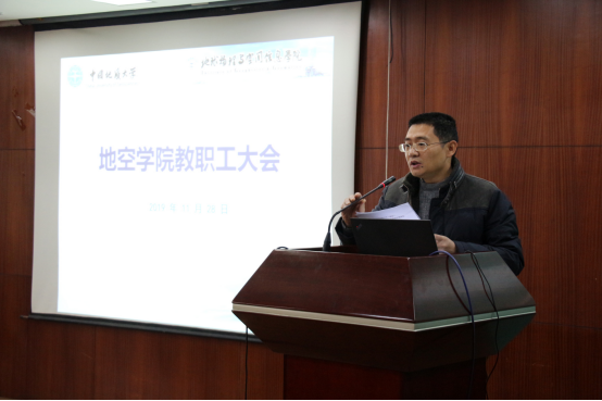 在物探楼222报告厅召开全院教职工大会,学习党的十九届四中全会精神。学院全体教职工参加,会议由学院党委书记刘子忠主持。