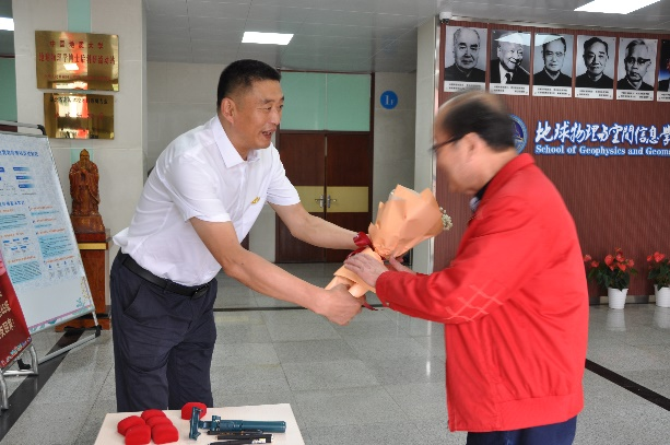 222报告厅举行。会前学校党委副书记王甫代表学校来到物探楼前亲切看望聚会老校友及他们的家属。学院为每位老校友和家属送上一束鲜花,表达学院师生对为国家地球物理勘探事业发展做出贡献的老校友的崇敬。大会由65级校友何定一主持。