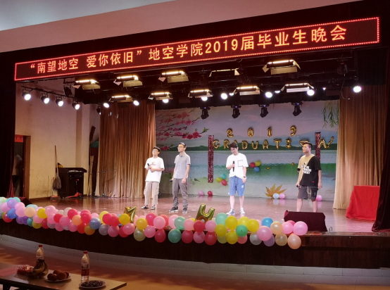学院毕业研究生朱海为大家带来歌曲弹唱《当你老了》,其沧桑的声音中带着几分离别的情丝,令人不舍。陈永焱同学的一首《幸福万年长》以及郭金涵同学的一曲葫芦丝演奏《星月神话》,将现场观众带离了方才离别的丝丝忧伤,和着欢快的节奏,大家开始一同跟随演唱,迅速点燃了现场的气氛。地信一班的《土味情话》,穿插在歌曲与舞蹈中间,更是让人忍俊不禁。
