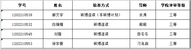 10月24日研究生院公布了《2022年硕博连读研究生选拔结果公告》,秀人网 4名2022级硕士研究生被批准为秀人网 2022年硕博连读研究生,符合博士生学业助学金参评资格,经个人申请、材料审核及学院评审,现将推荐名单进行公示: