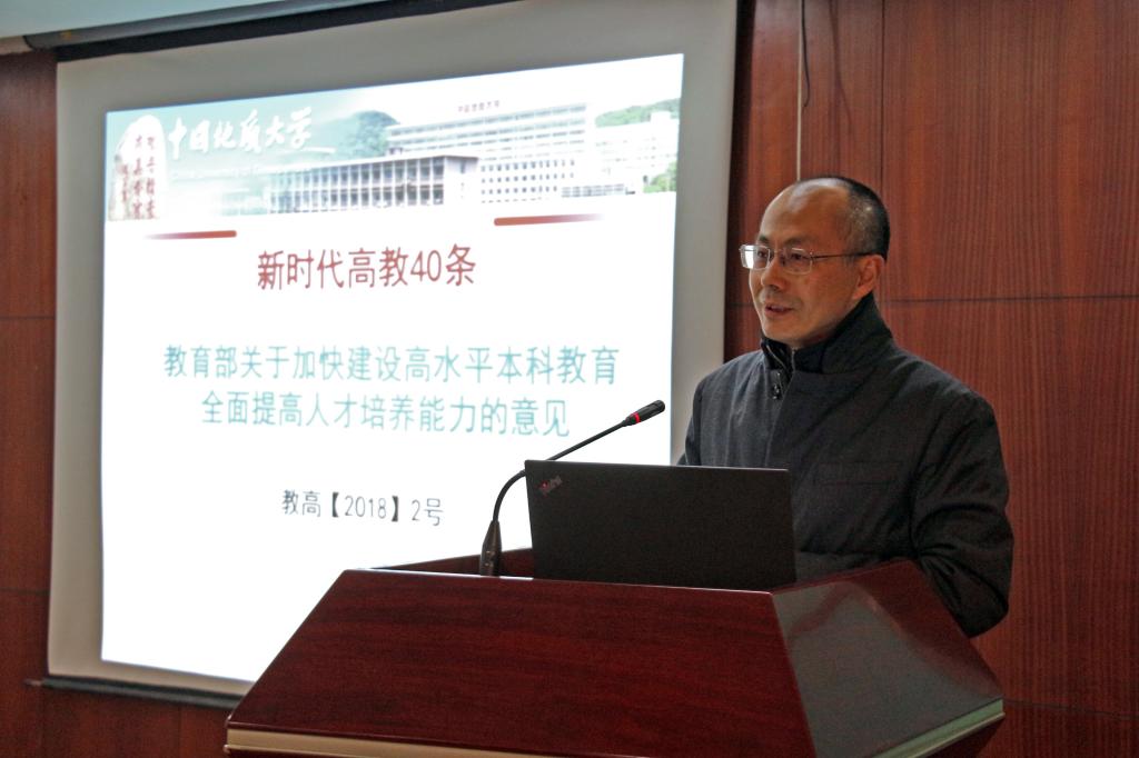 学院党委书记刘子忠对全体教师提出了三点要求:一是要认真学习领悟习近平总书记与陈宝生部长重要讲话,认真学习学校相关政策;二是提高思想认识,办人民满意的教育;三是排查教学中的问题,将“以本为本、四个回归、严在地大”落到实处。