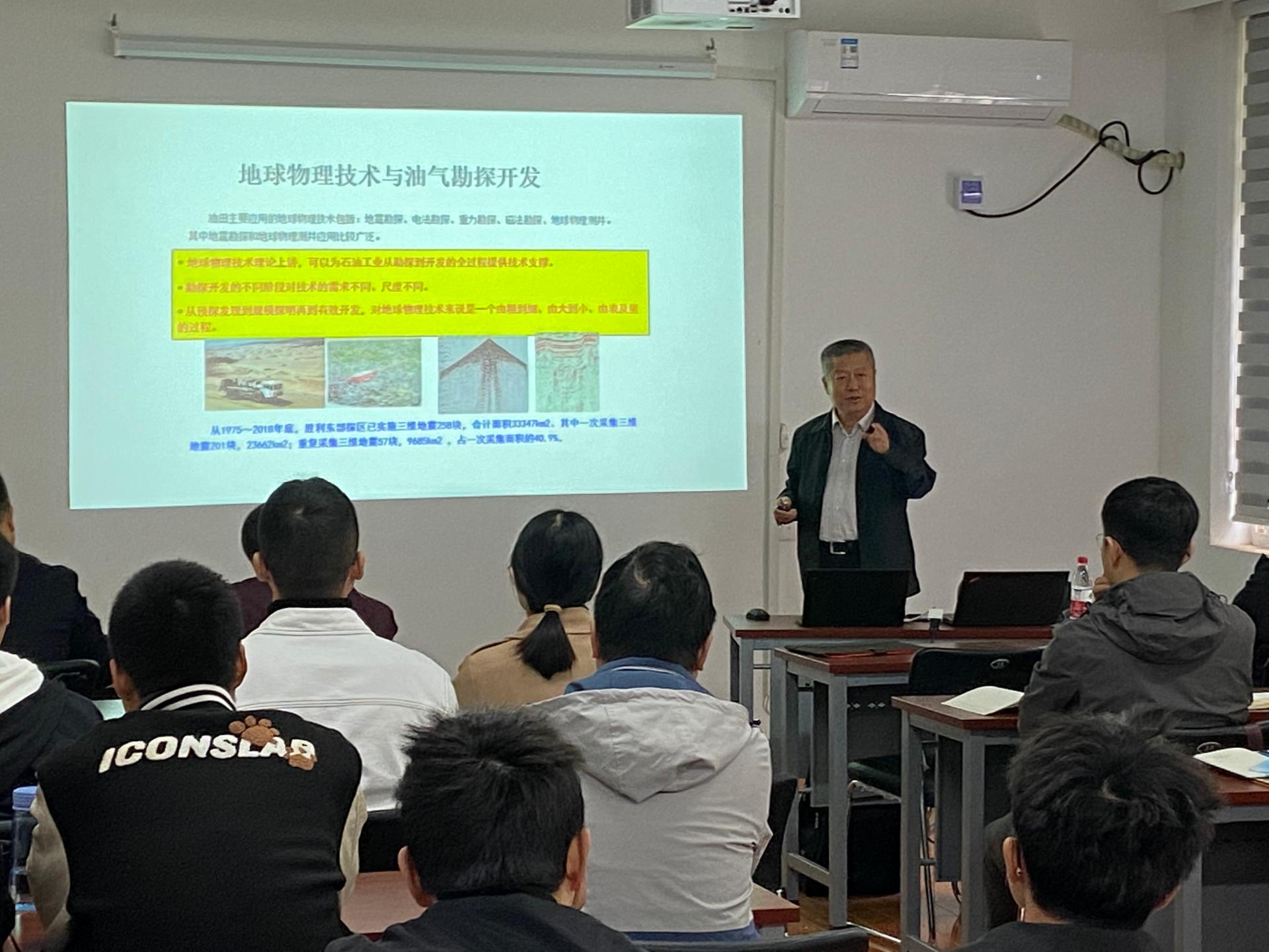 上午9:00-11:00,王延光首席做客地空论坛,在基委楼113会议室作了“地球物理技术与油气勘探开发”的学术报告,全校从事油气地震勘探方向的师生到场聆听讲座。王首席结合近40年的地球物理勘探从业经历,简述了物探技术在油气勘探开发中的核心作用,重点讲述了单点高密度地震等油气勘探领域的先进技术,分析总结了中石化油气勘探面临的问题及物探技术未来的发展方向,最后指出物探领域大有可为,鼓励同学们立足国家需求为国找油。讨论环节,王首席与在场师生就油气资源勘探技术的前沿问题和油气勘探形势及碳排放等问题进行了交流。