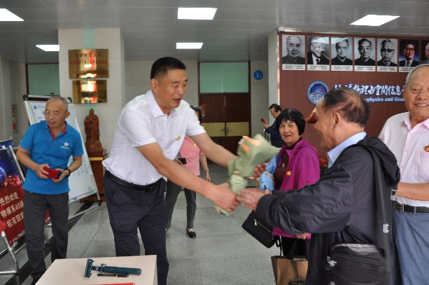 222报告厅举行。会前学校党委副书记王甫代表学校来到物探楼前亲切看望聚会老校友及他们的家属。学院为每位老校友和家属送上一束鲜花,表达学院师生对为国家地球物理勘探事业发展做出贡献的老校友的崇敬。大会由65级校友何定一主持。